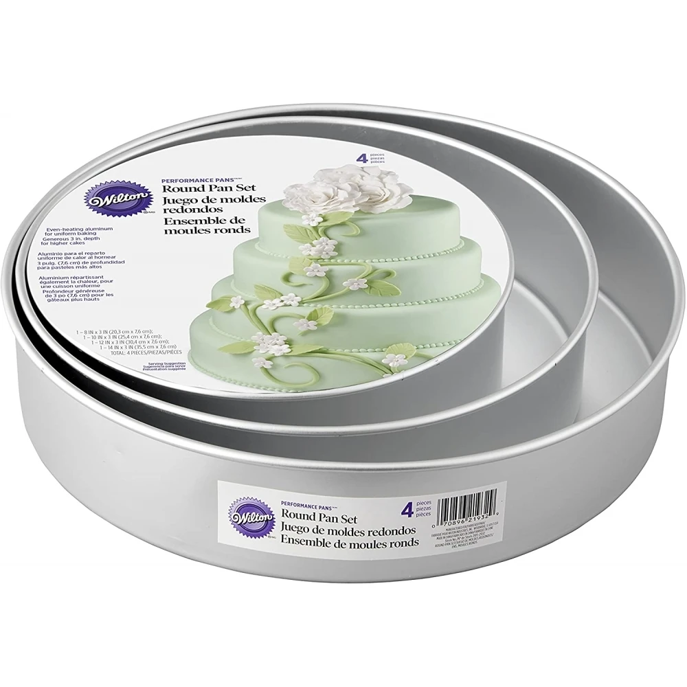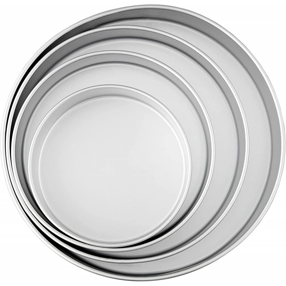 Set includes 8, 10, 12, 14 in. pans. Quality aluminum holds its shape for years. Each pan is 3 in. deep.