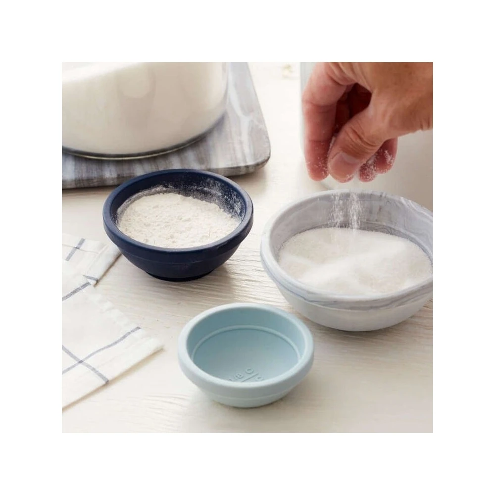 Measurement guides inside each bowl for full and half measurements – small bowl measures 1/4 and 1/8 cups; medium bowl measures 1/2 and 1/4 cups; large bowl measures 1 and 1/2 cups.