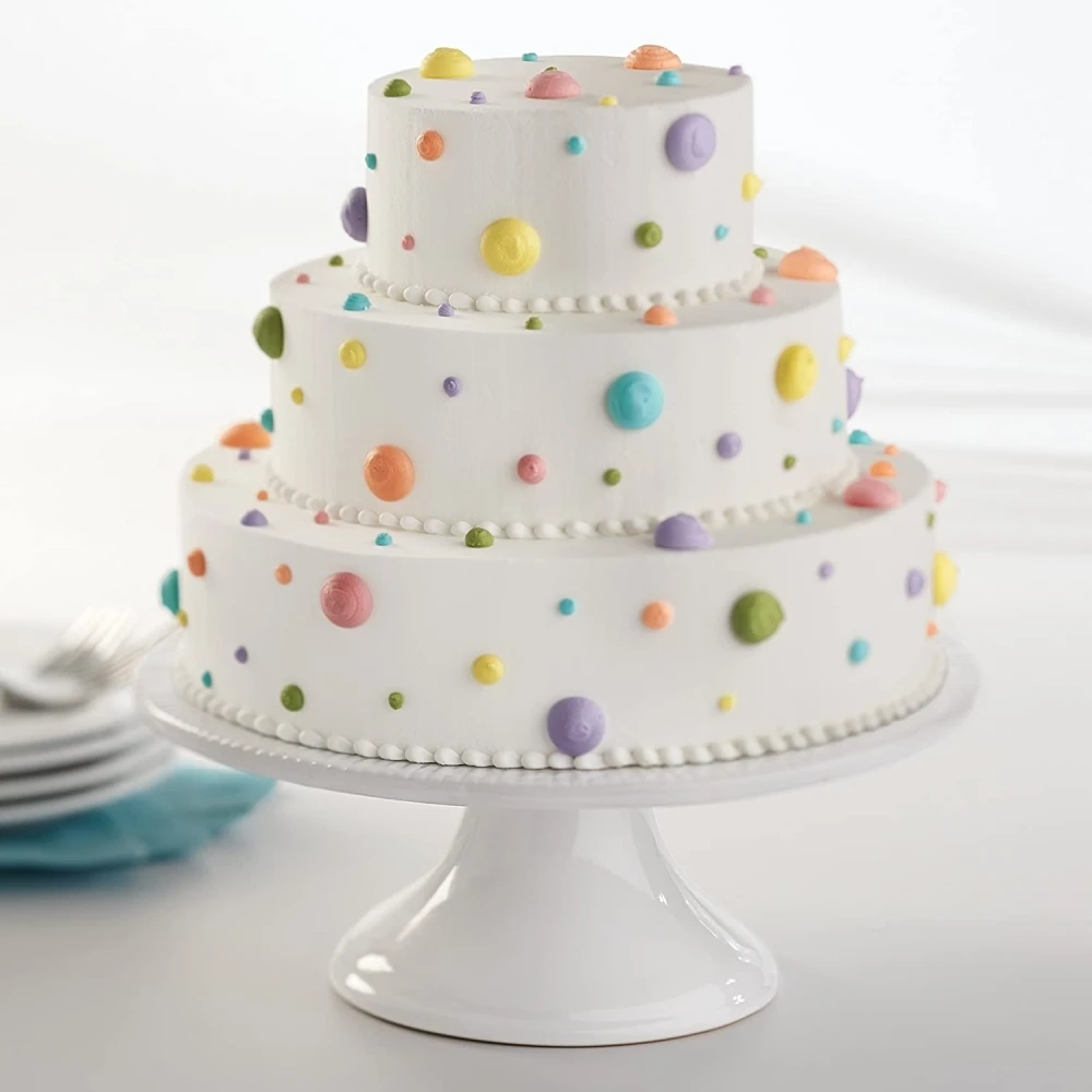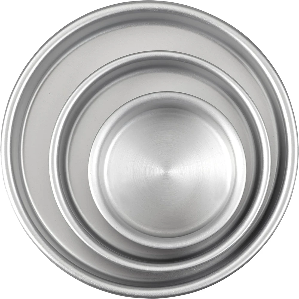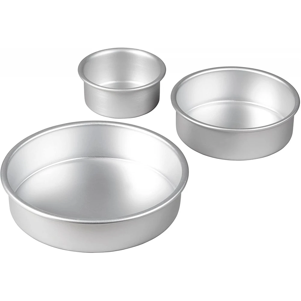 The Wilton Tiered Trio Round Pan Set contains three round baking pans for making a beautiful stacked cake! Use the baking pans for making a cake for a birthday, anniversary and may other occasions. The baking pans are made of aluminum.